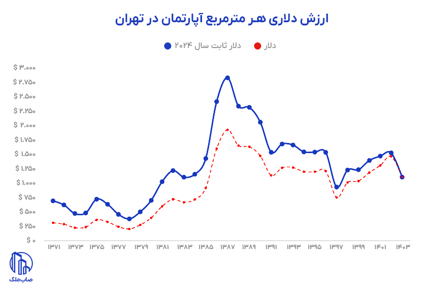 اما این مقایسه به تنهایی کافی نیست. باید در نظر داشت که ارزش دلار نیز در طول زمان تغییر کرده است. قدرت خرید ۲۵۰ دلار سال ۱۳۷۷ تقریباً معادل ۵۰۰ دلار امروز است. بنابراین برای مقایسه درست لازم است ارزش هر متر مسکن را به قیمت دلار در یک سال مشخص محاسبه و مقایسه کنیم. نمودار آبی رنگ ارزش هر متر آپارتمان در تهران را به قیمت دلار سال ۲۰۲۴ نشان میدهد: