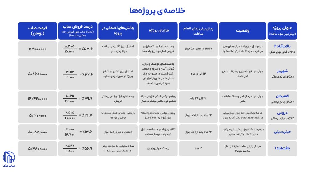 در حال حاضر (آبان ۱۴۰۳) ، شش پروژه فعال با نامهای یافتآباد۱و یافتآباد۲، لاهیجان، شهریار، دروس، و مینیسیتی در دست ساخت داریم. این گزارش با هدف ارائهی دید کلی به سرمایهگذارانی که تاکنون با صاب ملک همکاری کردهاند و یا به سرمایهگذاری در این پروژهها علاقهمند هستند، تهیه شده است. در ادامه، به تشریح تکتک این پروژهها میپردازیم تا شما از جزئیات، وضعیت کنونی، و چشمانداز هر پروژه آگاه شوید و از فرصتهای پیش روی این مجموعه بهرهمند گردید.