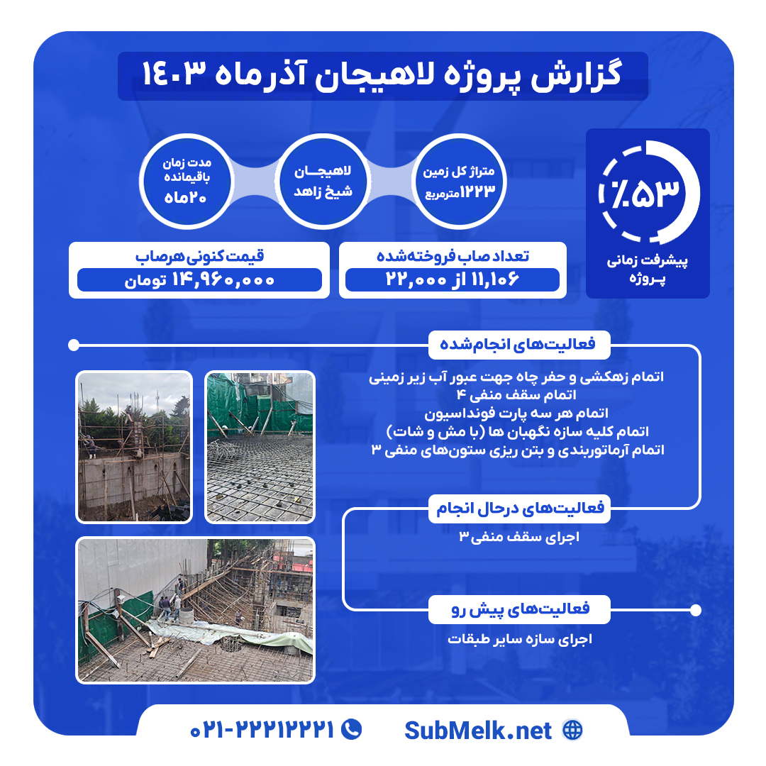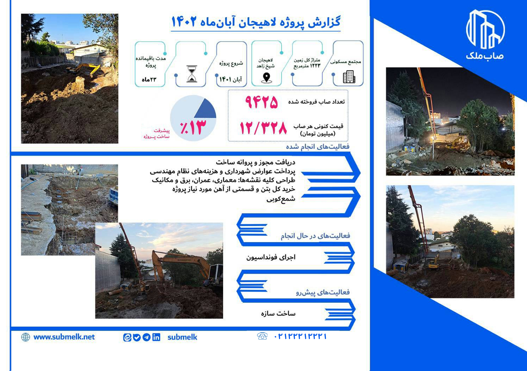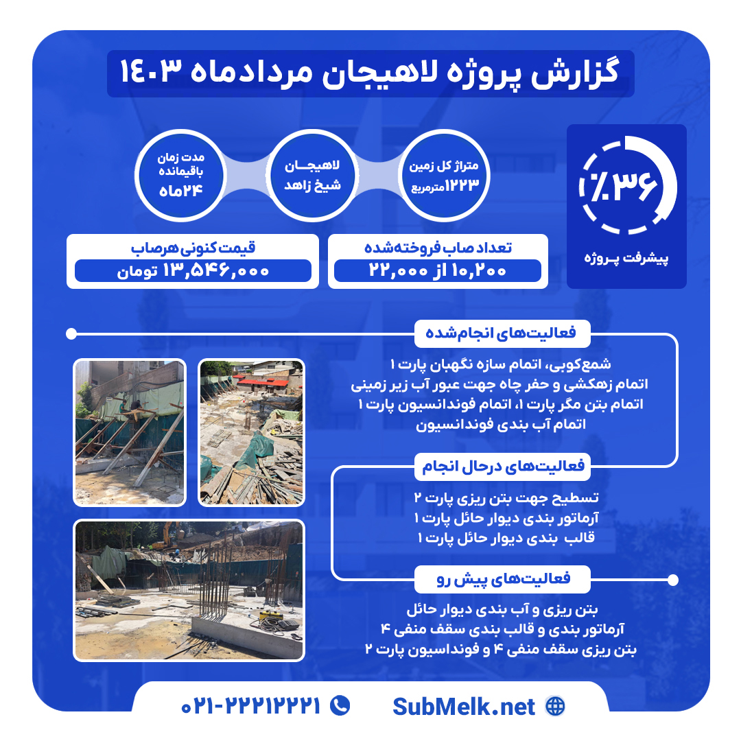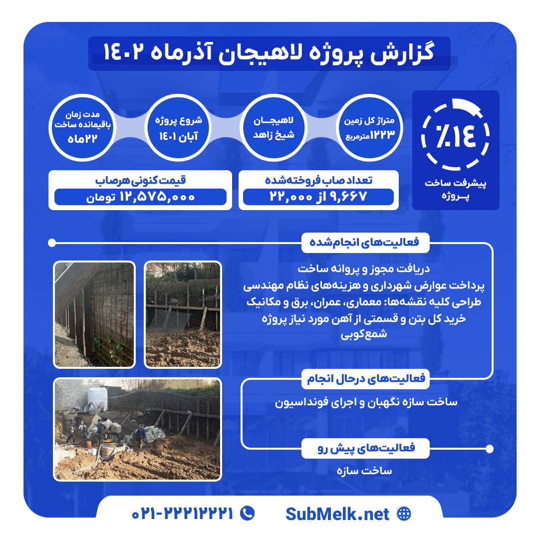 پروژه لاهیجان از زمان آغاز در پائیز ۱۴۰۱ تا به اکنون موفق به تکمیل مراحل کلیدی متعددی شده است، از جمله دریافت مجوز و پروانه ساخت، پرداخت عوارض شهرداری و هزینه های نظام مهندسی، طراحی کلیه نقشهها (شامل معماری، عمران، برق و مکانیک)، خرید کل بتن و نیمی از آهن مورد نیاز پروژه، شمع کوبی، فوندانسیون پارت ۱، اتمام سازه نگهبان پارت ۱، اتمام بتن مگر پارت ۱، اتمام آب بندی فوندانسیون، اتمام زهکشی و حفر چاه جهت عبور آب زیر زمینی به پایان رسیده است. در حال حاضر، عملیات اجرای آرماتور بندی دیوار های حائل پایین ترین کد ارتفاعی ، هموار سازی برای بتن مگر جهت فوندانسیون پارت ۲ ، شاتکریت (بتن پاششی)، قالب بندی دیوار حائل در حال اجرا است. مراحل پیش رو شامل بتن مگر پارت ۲ ، فوندانسیون پارت ۲ ، شاتکریت سازه نگهبان ، بتنریزی و آببندی دیوار حائل و اجرای سقف خواهد بود.