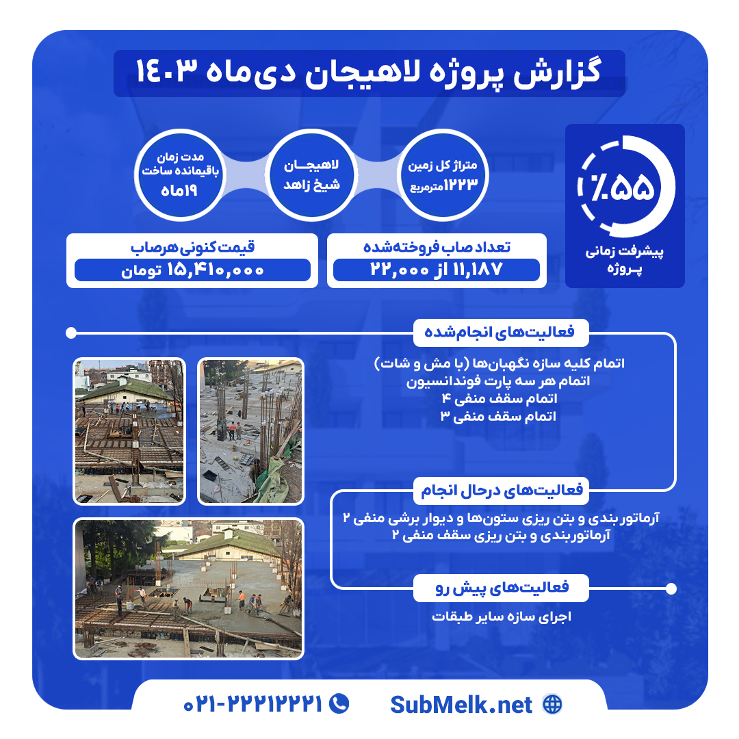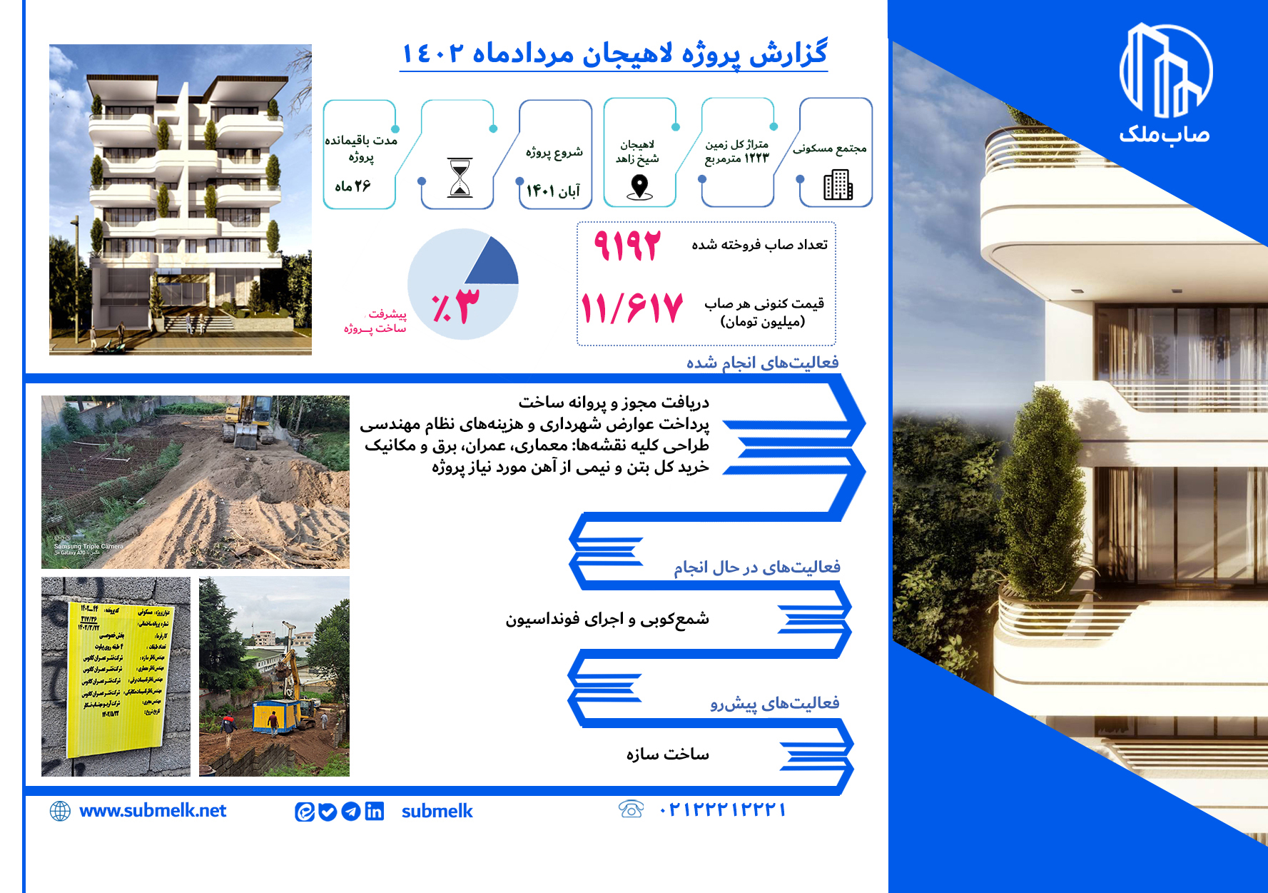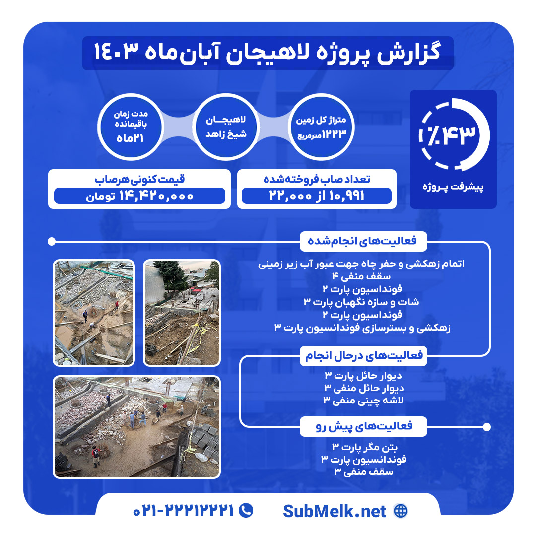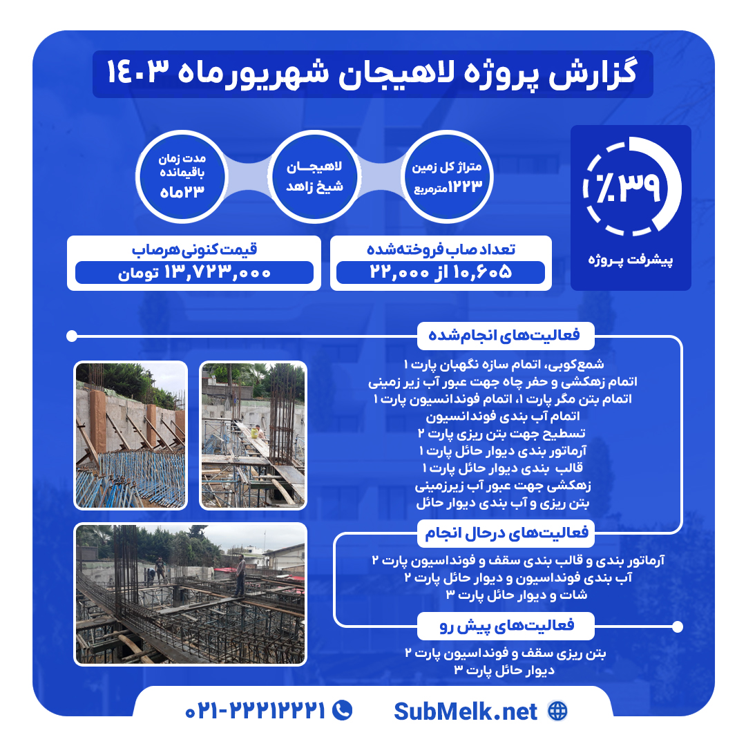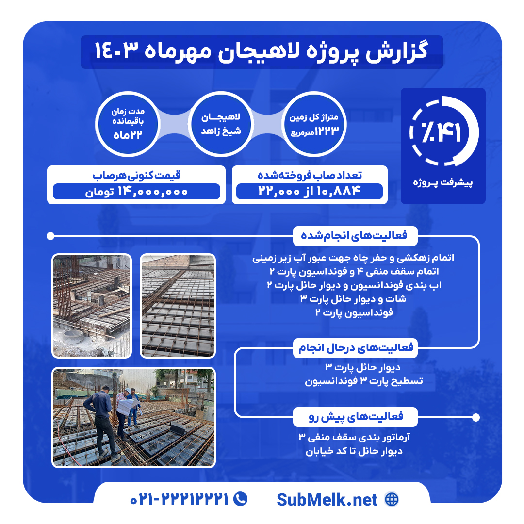 پروژه لاهیجان از زمان آغاز در پائیز ۱۴۰۱ تا به اکنون موفق به تکمیل مراحل کلیدی متعددی شده است، از جمله دریافت مجوز و پروانه ساخت، پرداخت عوارض شهرداری و هزینه های نظام مهندسی، طراحی کلیه نقشهها (شامل معماری، عمران، برق و مکانیک)، خرید کل بتن و نیمی از آهن مورد نیاز پروژه، شمع کوبی، فوندانسیون پارت ۱، اتمام سازه نگهبان پارت ۱، اتمام بتن مگر پارت ۱، اتمام آب بندی فوندانسیون، اتمام زهکشی و حفر چاه جهت عبور آب زیر زمینی به پایان رسیده است. در حال حاضر، عملیات اجرای آرماتور بندی دیوار های حائل پایین ترین کد ارتفاعی ، هموار سازی برای بتن مگر جهت فوندانسیون پارت ۲ ، شاتکریت (بتن پاششی)، قالب بندی دیوار حائل در حال اجرا است. مراحل پیش رو شامل بتن مگر پارت ۲ ، فوندانسیون پارت ۲ ، شاتکریت سازه نگهبان ، بتنریزی و آببندی دیوار حائل و اجرای سقف خواهد بود.